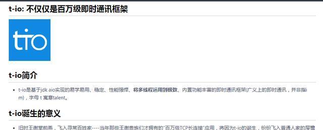 t-io是基于jdk aio实现的易学易用、稳定耐操、性能强悍、将多线程运用到极致、内置功能丰富、核心代码只有3000多行(2017年05月13号统计)的即时通讯框架(广义上的即时通讯,并非指im),字母 t 寓意talent。